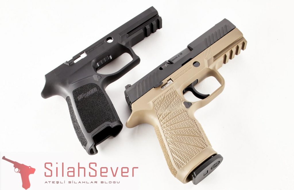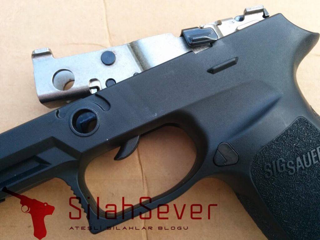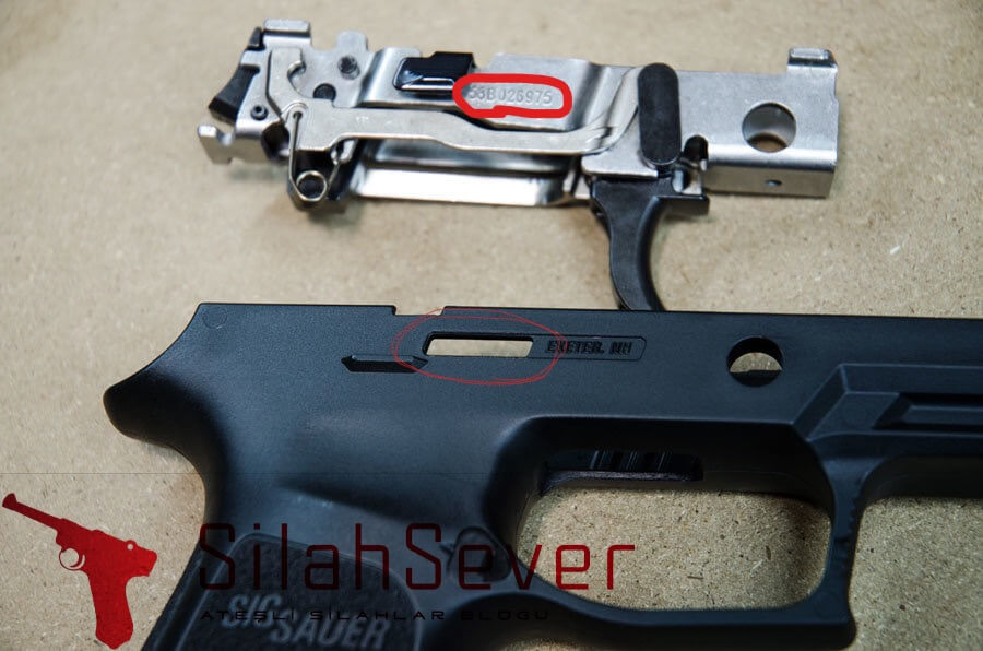 Kırmızı ile işaretlenmiş seri numarası ve seri numara çerçevesi bulunduran örnek P320 gövdesi